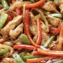 Using a slotted spoon, remove the vegetables to a plate. Add the remaining oil to the skillet, then add the chicken slices and the second half of the seasonings. Stir-fry until the chicken is almost fully cooked, about 4 minutes. Again, if the bottom of the skillet becomes too dry while you cook the chicken, add a splash of water.