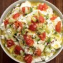 - Transfer dip to a serving bowl and top with cucumber, tomatoes, dill, and a drizzle of oil.